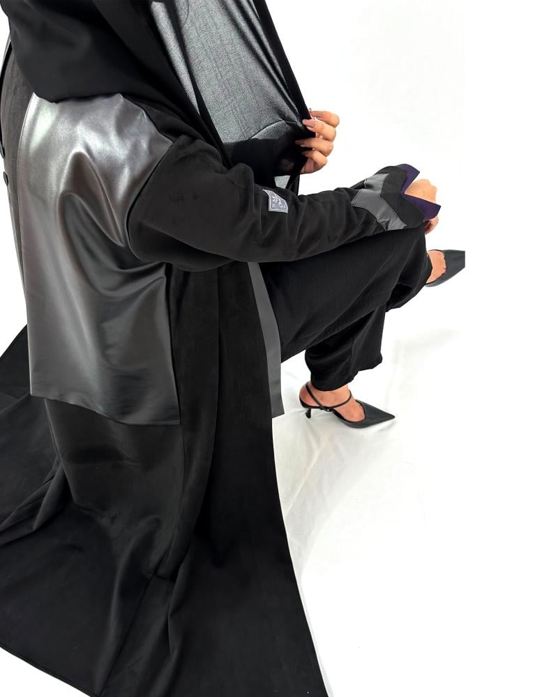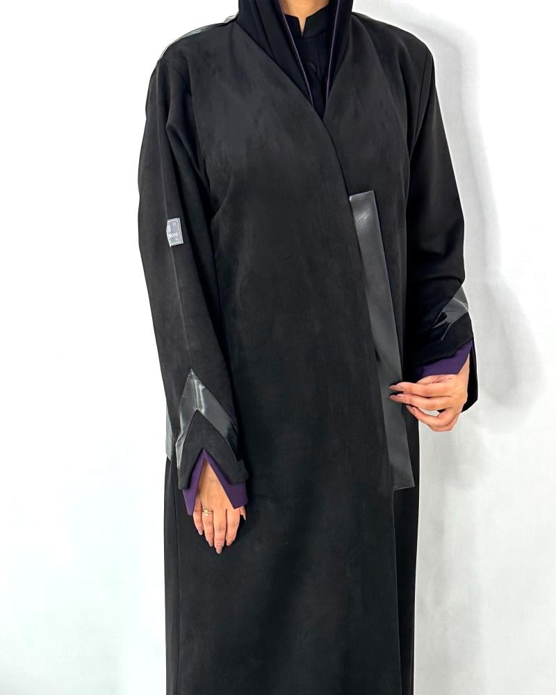 عباية سوداء من قماش الشمواه الفاخر مع تدخلات الجلد والكتان الاندونسي الذي يفضي اناقة على الإطلالة ويجعلها مميزة وجذابة