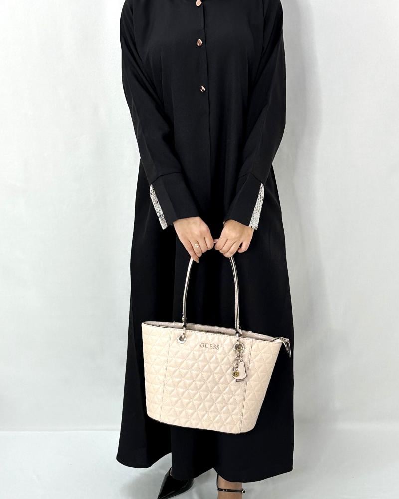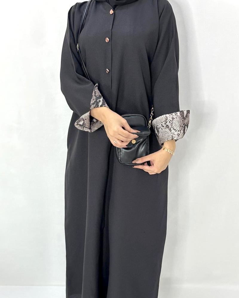 عباية سوداء اللون من قماش كريب الانترنت مع تدخيلات الشيفون المميز بجلد التمساح من الأكمام تجمع بين الفخامة والأناقة بتصميم متقن ومتميز